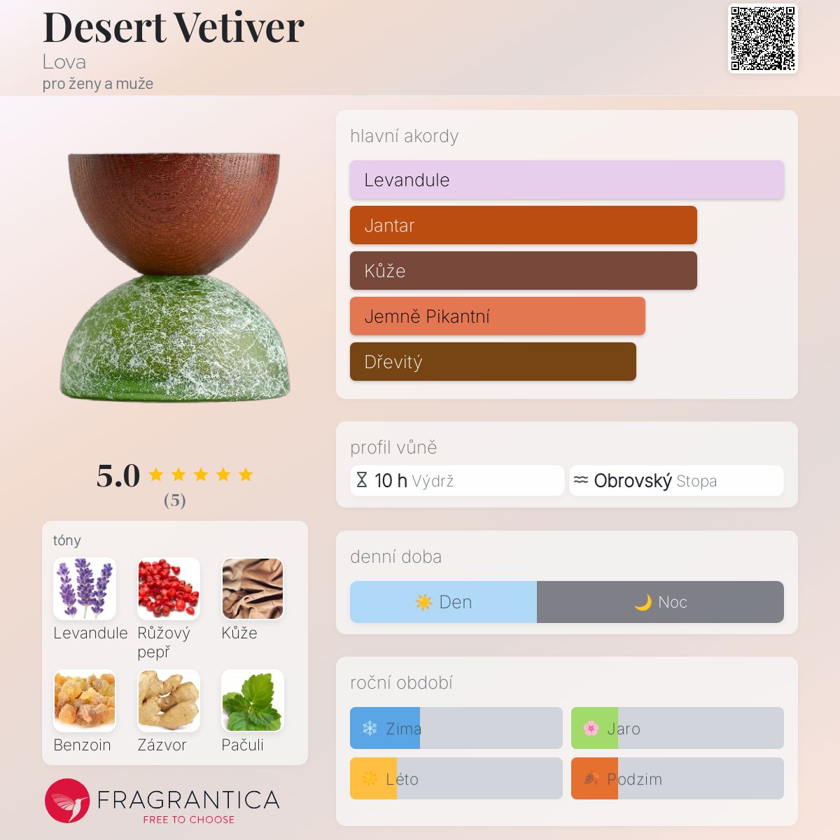 Desert Vetiver podle Lova je Woody Spicy vůně pro ženy a muže. Toto je nová vůně. Desert Vetiver byl/a uveden/a v roce 2025. "Nosem" za touto vůní je Shadi Samra. Vrchní tóny jsou Růžový pepř, Grapefruit, Bergamot a Muškátový oříšek; střední tóny jsouLevandule, Kůže, Zázvor, Pelargónie a Elemi ; základní tóny jsou Benzoin, Pačuli, Vetiver, Kašmírové dřevo, Santalové dřevo a Cedr.