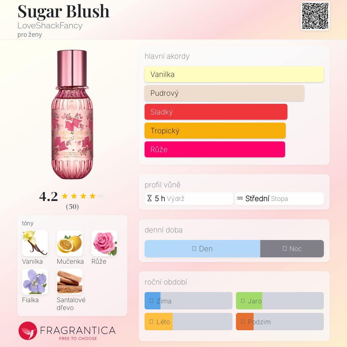 Sugar Blush podle LoveShackFancy je Floral Fruity Gourmand vůně pro ženy. Toto je nová vůně. Sugar Blush byl/a uveden/a v roce 2024. "Nosem" za touto vůní je Jérôme Epinette. Vrchní tón je Mučenka ; střední tóny jsouRůže a Fialka ; základní tóny jsou Vanilkový cukr a Santalové dřevo.