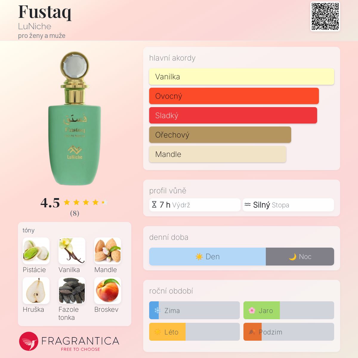 Fustaq podle LuNiche je vůně pro ženy a muže. Vrchní tóny jsou Pistácie a Sladká mandle; střední tóny jsouHruška, Broskev a Pivoňka ; základní tóny jsou Vanilka a Fazole tonka.