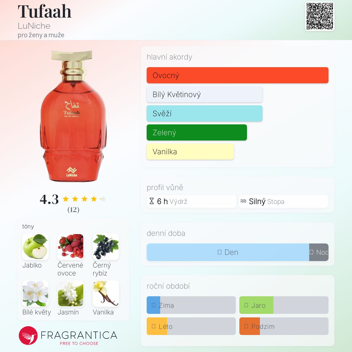 Tufaah podle LuNiche je vůně pro ženy a muže. Vrchní tóny jsou Jablko, Červené ovoce a Černý rybíz; střední tóny jsouBílé květy a Jasmín ; základní tóny jsou Vanilka a Jantar (ambra).