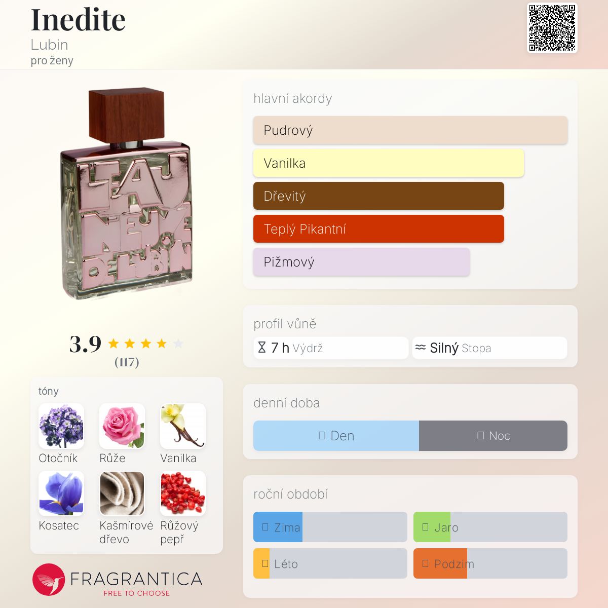 Inedite podle Lubin je Orientální Spicy vůně pro ženy. Inedite byl/a uveden/a v roce 2009. "Nosem" za touto vůní je Thomas Fontaine. Vrchní tóny jsou Růžový pepř, Pepř, Bergamot a Mandarinka; střední tóny jsouOtočník, Růže, Nektarinka, Skořice, Hřebíček, Koriandr a Šeřík ; základní tóny jsou Vanilka, Kosatec, Kašmírové dřevo, Pačuli, Pižmo a Virginský cedr.