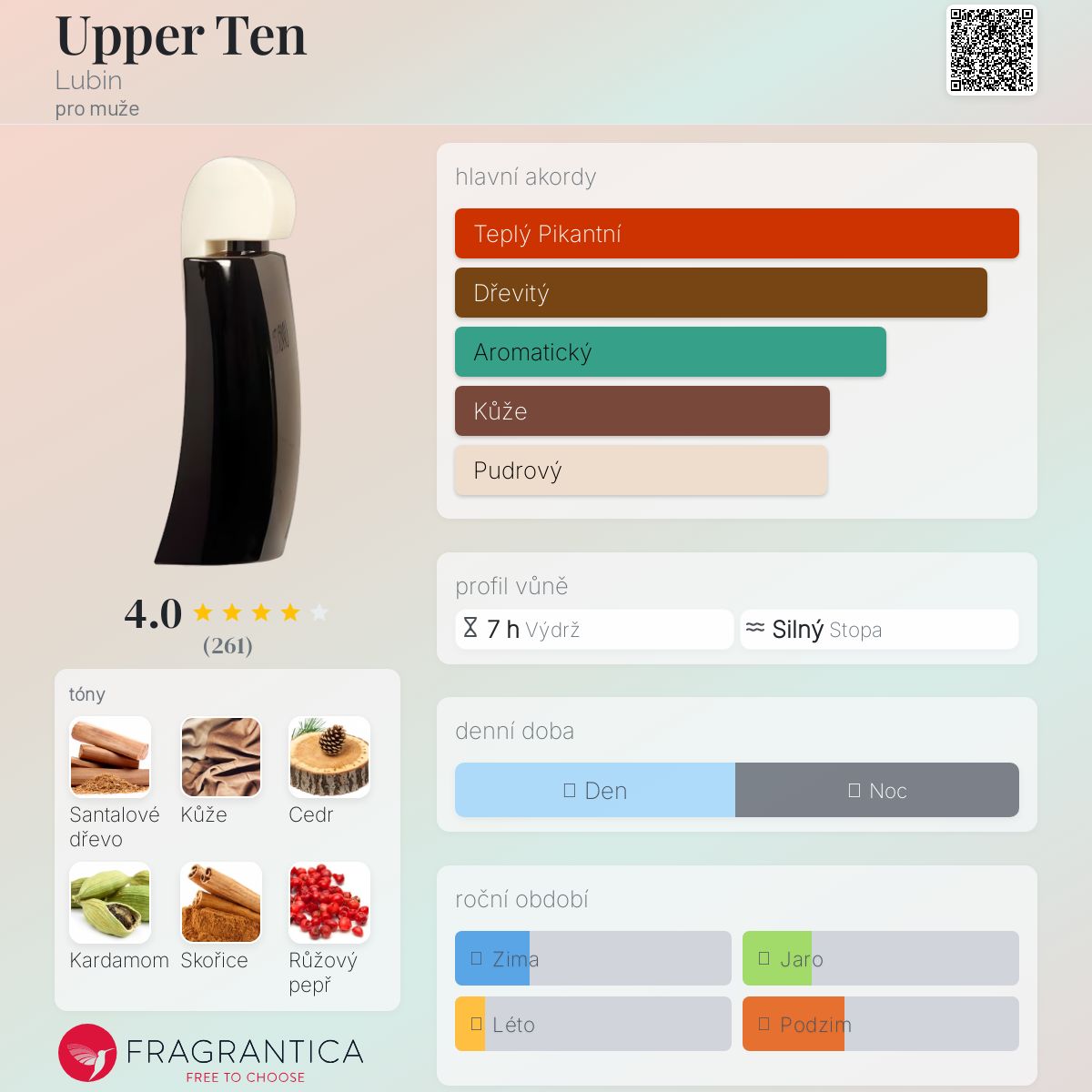 Upper Ten podle Lubin je Floral Woody Musk vůně pro muže. Upper Ten byl/a uveden/a v roce 2015. Vrchní tóny jsou Růžový pepř, Šafrán, Jalovcové bobulky a Bergamot; střední tóny jsouKardamom, Skořice, Broskev, Pomerančový květ a Pelargónie ; základní tóny jsou Santalové dřevo, Kůže, Cedr, Pižmo, Jantar (ambra) a Pačuli.