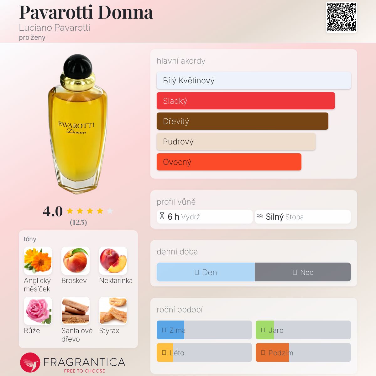 Pavarotti Donna podle Luciano Pavarotti je Chypre Floral vůně pro ženy. Pavarotti Donna byl/a uveden/a v roce 1995. Vrchní tóny jsou Měsíček, Broskev, Nektarinka, Ananas, Květ afrického pomeranče a Yuzu; střední tóny jsouRůže, Gardénie, Ylang-Ylang, Konvalinka, Jasmín, Fialka a Lilie ; základní tóny jsou Santalové dřevo, Styrax, Dubový mech, Jantar (ambra), Virginský cedr, Pačuli, Vanilka, Kořen orris a Pižmo.
