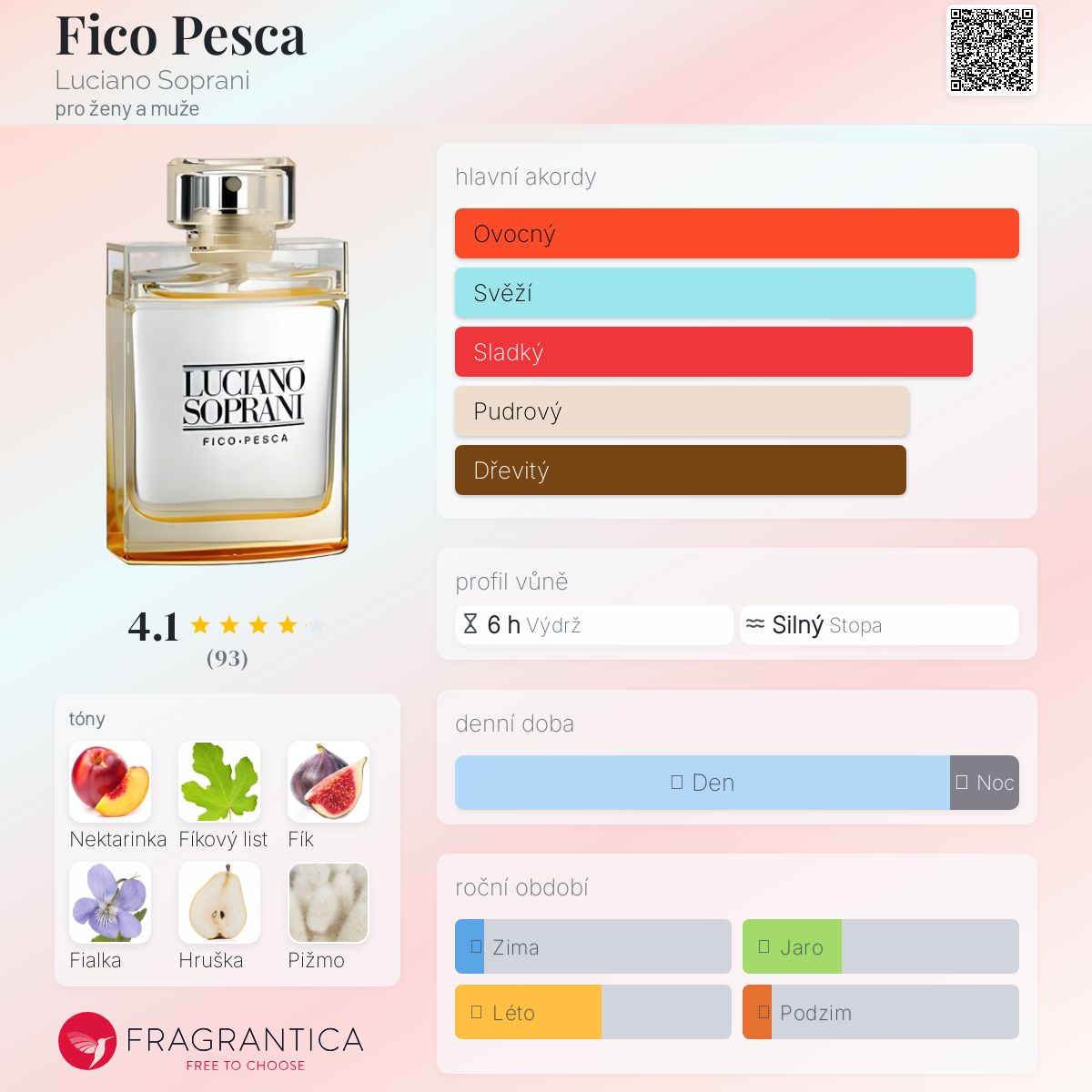 Fico Pesca podle Luciano Soprani je Floral Fruity vůně pro ženy a muže. Fico Pesca byl/a uveden/a v roce 2014. Vrchní tóny jsou Nektarinka, Fíkový list a Kalábrijský bergamot; střední tóny jsouFík, Fialka, Hruška, Brambořík a Jasmín ; základní tóny jsou Pižmo, Cedr a Santalové dřevo.