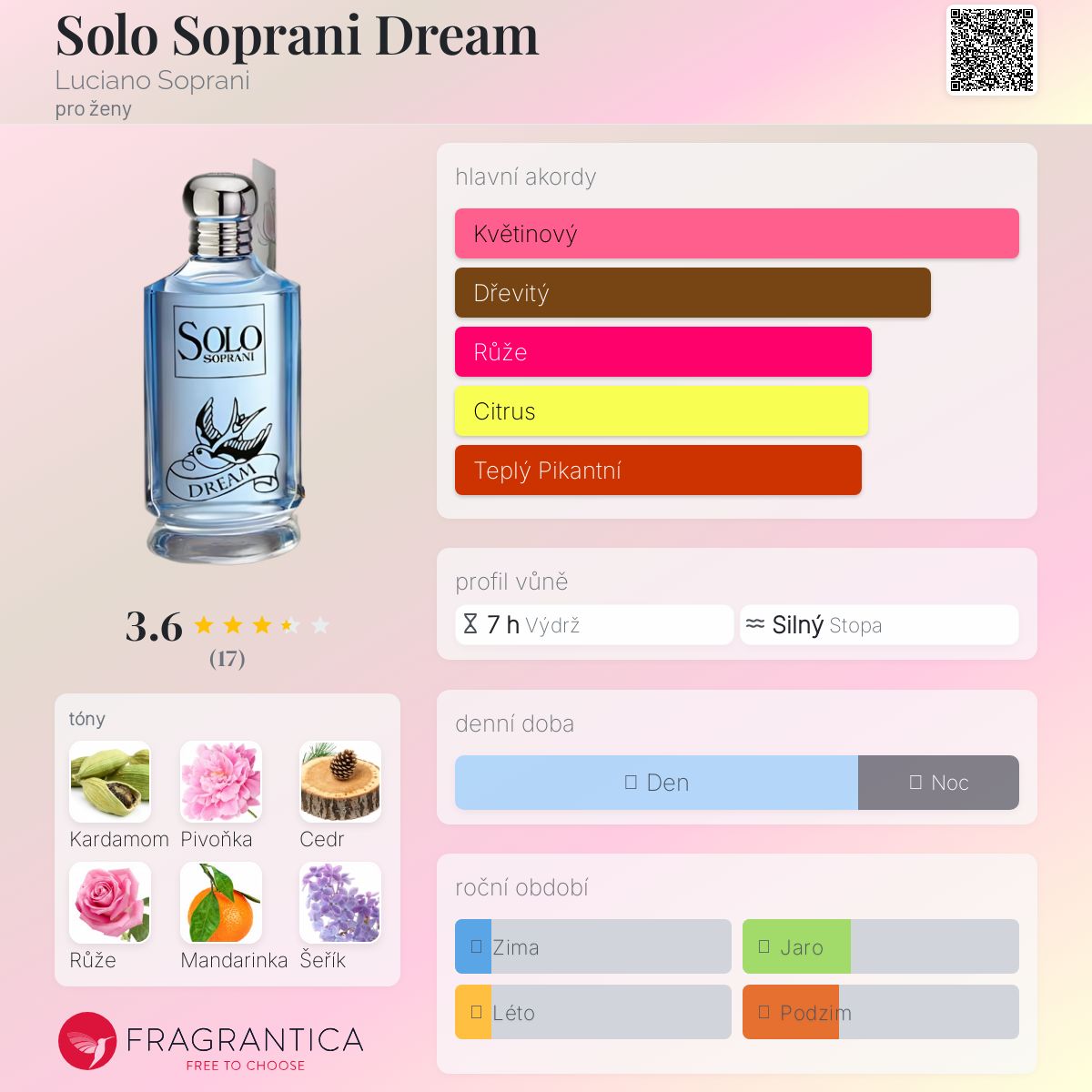 Solo Soprani Dream podle Luciano Soprani je Orientální Floral vůně pro ženy. Solo Soprani Dream byl/a uveden/a v roce 2016. "Nosem" za touto vůní je Evelyne Boulanger. Vrchní tóny jsou Kardamom, Mandarinka, Bergamot a Květ jabloně; střední tóny jsouPivoňka, Bílá růže, Šeřík a Len setý ; základní tóny jsou Cedr, Pižmo, Santalové dřevo a Jantar (ambra).