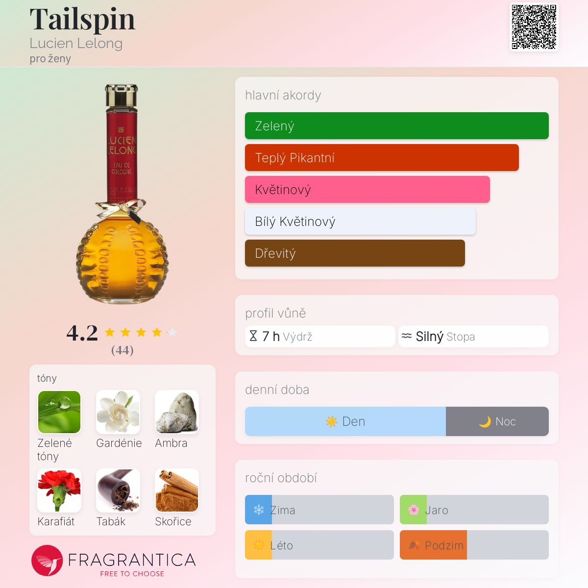 Tailspin podle Lucien Lelong je Floral Green vůně pro ženy. Tailspin byl/a uveden/a v roce 1940. "Nosem" za touto vůní je Jean Carles. Vrchní tóny jsou Bylinné tóny, Zelené tóny, Skořice, Aldehydy, Citrusy, Hřebíček a Ovocné tóny; střední tóny jsouGardénie, Karafiát, Hyacint, Bulharská růže a Konvalinka ; základní tóny jsou Ambra, Tabák, Pryskyřice, Dubový mech, Borovice, Pačuli, Pelyněk, Santalové dřevo, Galbanum a Pižmo.