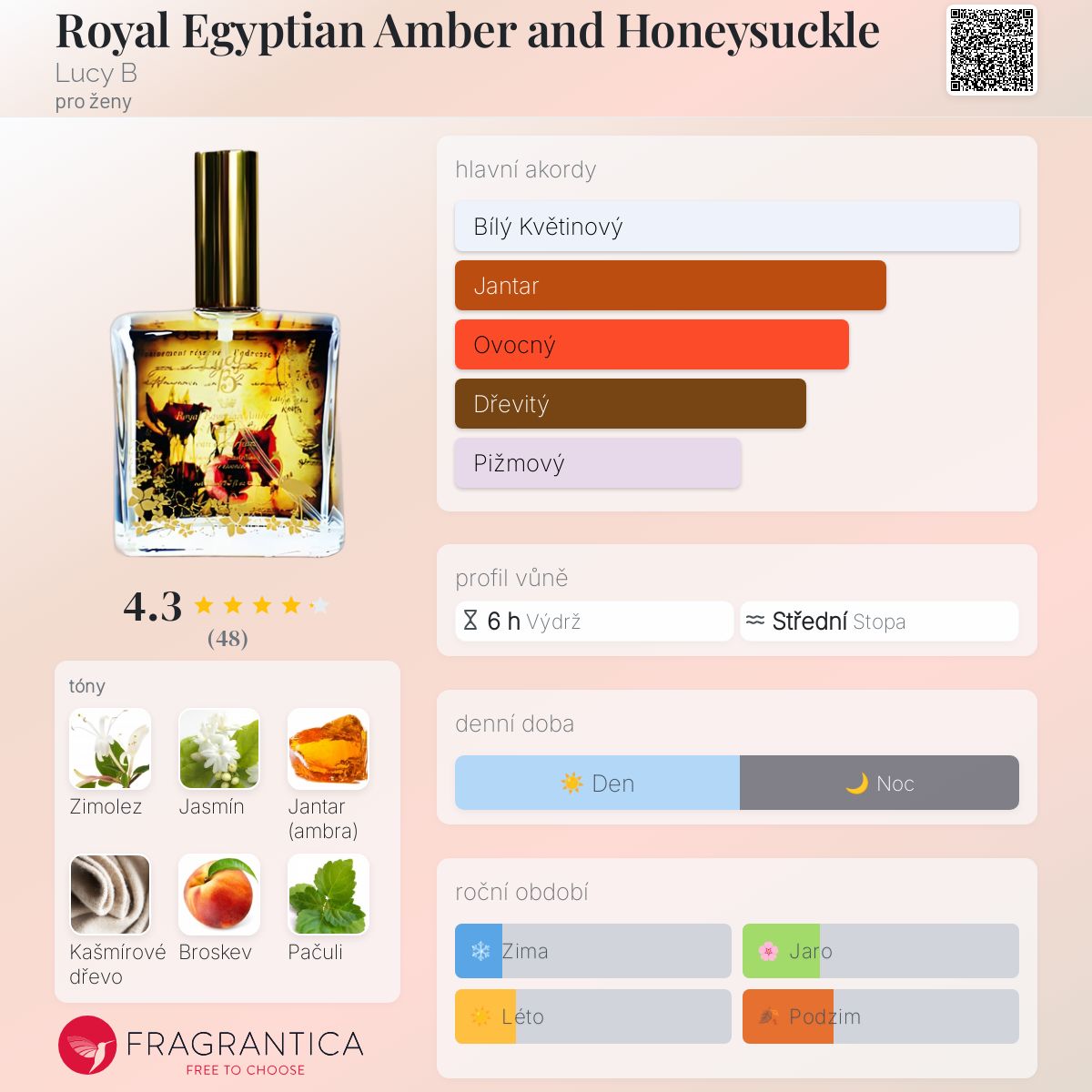 Royal Egyptian Amber and Honeysuckle podle Lucy B je Orientální Floral vůně pro ženy. Royal Egyptian Amber and Honeysuckle byl/a uveden/a v roce 2010. Vrchní tóny jsou Zimolez a Broskev; střední tóny jsouJasmín a Pačuli ; základní tóny jsou Jantar (ambra) a Kašmírové dřevo.