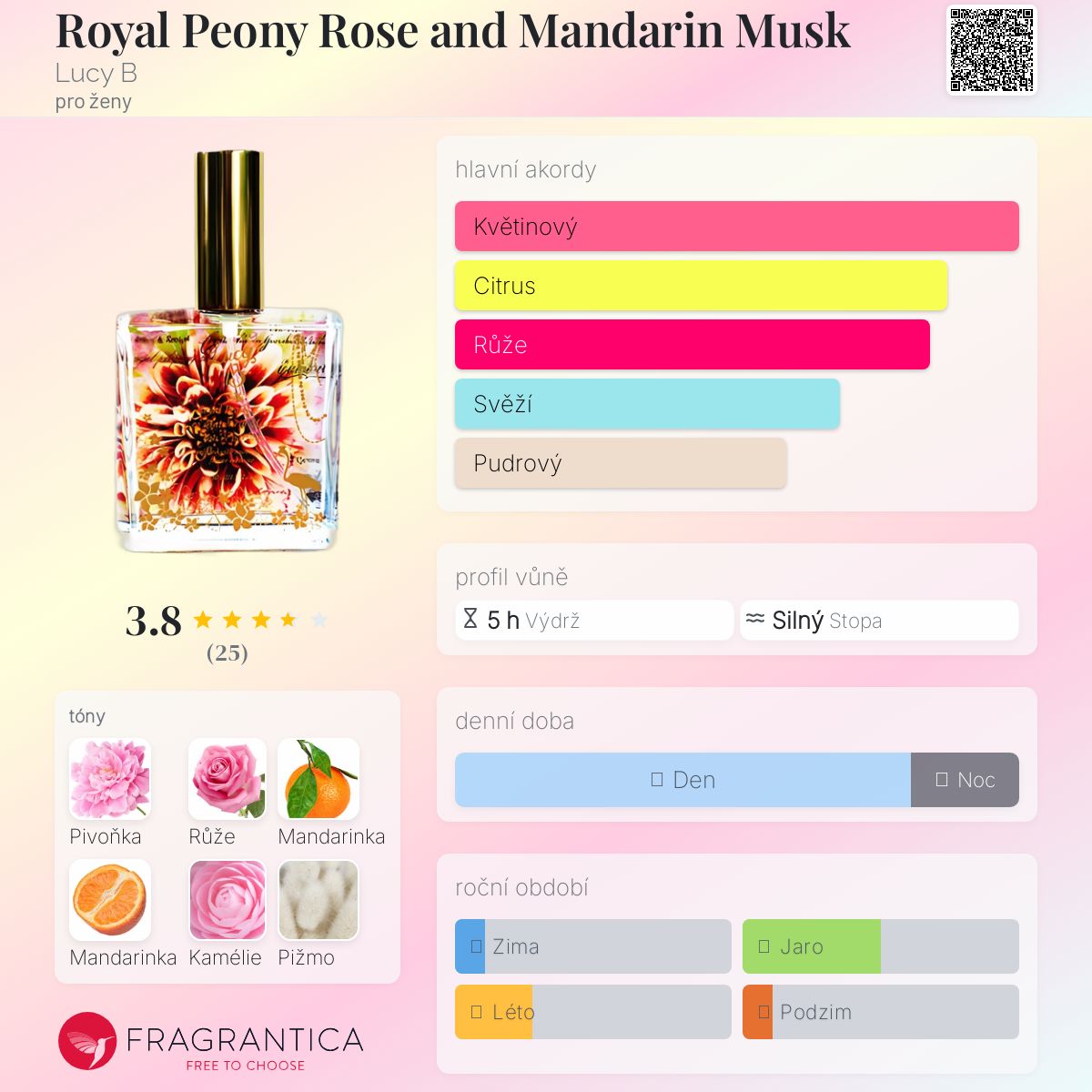Royal Peony Rose and Mandarin Musk podle Lucy B je Floral Fruity vůně pro ženy. Royal Peony Rose and Mandarin Musk byl/a uveden/a v roce 2010. Vrchní tóny jsou a Mandarinka a Mandarinka; střední tóny jsouPivoňka a Růže ; základní tóny jsou Kamélie a Pižmo.