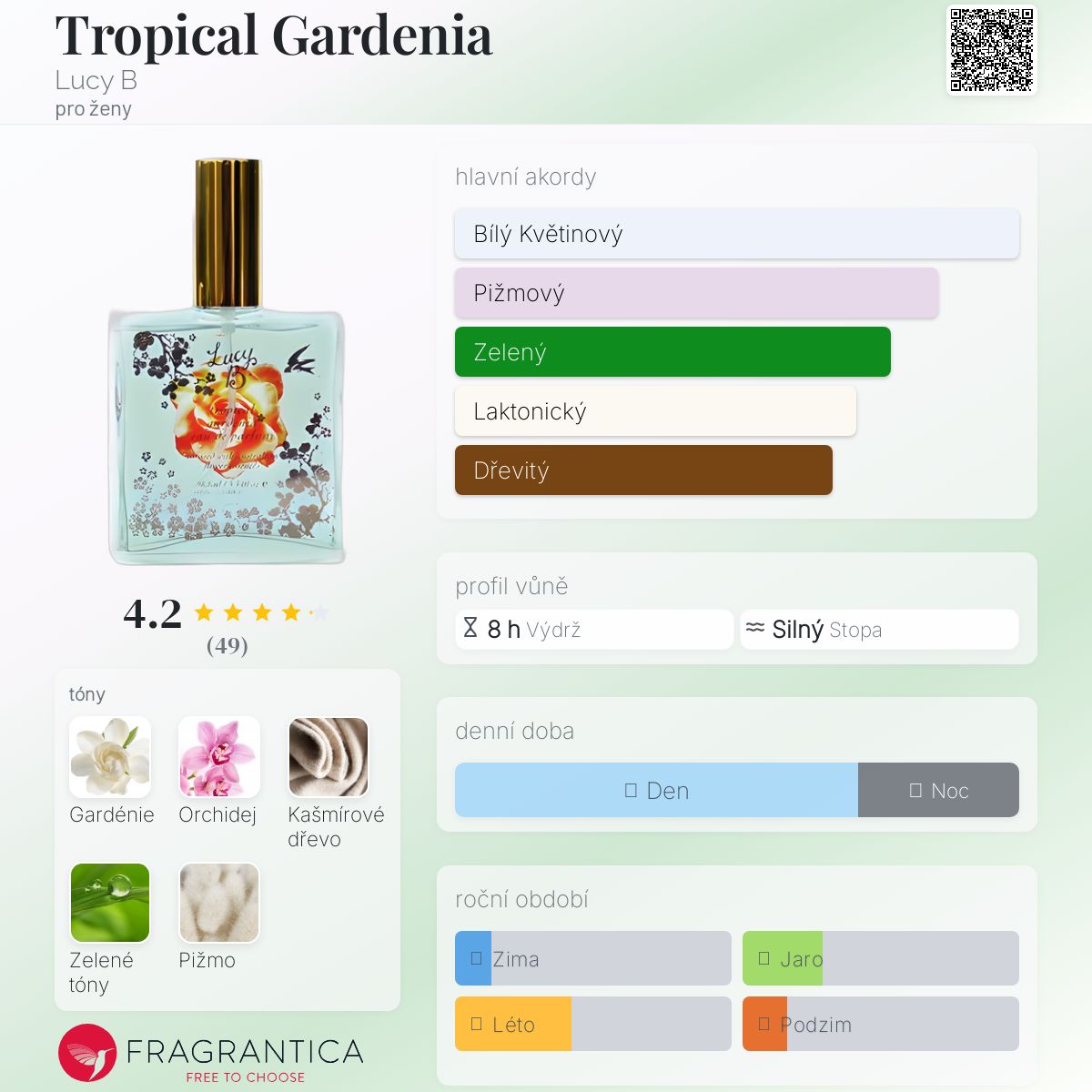 Tropical Gardenia podle Lucy B je Floral vůně pro ženy. Vrchní tón je Gardénie ; střední tóny jsouOrchidej a Zelené tóny ; základní tóny jsou Kašmírové dřevo a Pižmo.