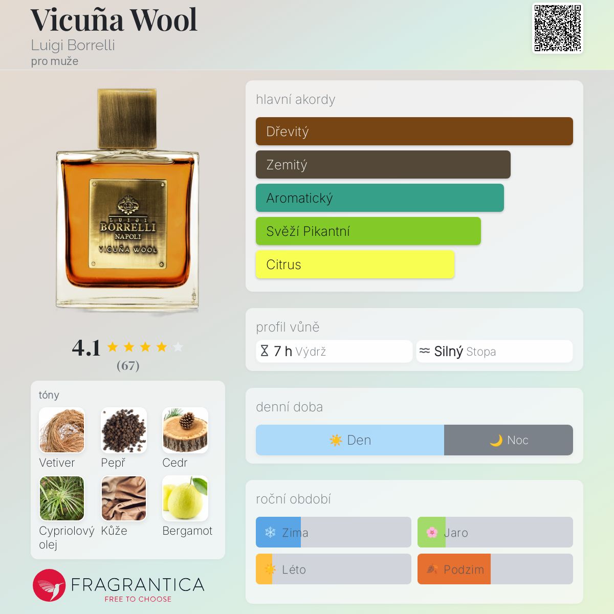Vicuña Wool podle Luigi Borrelli je Woody Spicy vůně pro muže. Vicuña Wool byl/a uveden/a v roce 2016. Vrchní tóny jsou Černý pepř, Bergamot, Elemi a Citrón; střední tóny jsouCypriolový olej, Kůže, Dubový mech a Konvalinka ; základní tóny jsou Vetiver, Cedr, Pačuli, Jantar (ambra) a Pižmo.