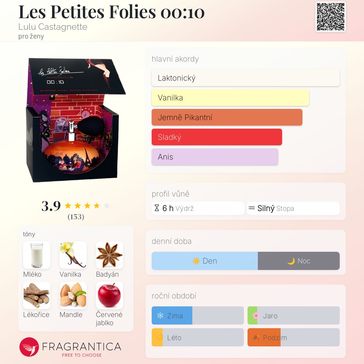 Les Petites Folies 00:10 podle Lulu Castagnette je Orientální Floral vůně pro ženy. Les Petites Folies 00:10 byl/a uveden/a v roce 2010. "Nosem" za touto vůní je Karine Dubreuil-Sereni. Vrchní tóny jsou Badyán, Lékořice a Hloh; střední tóny jsouČervené jablko, Jasmín a Konvalinka ; základní tóny jsou Mléko, Vanilka a Mandle.