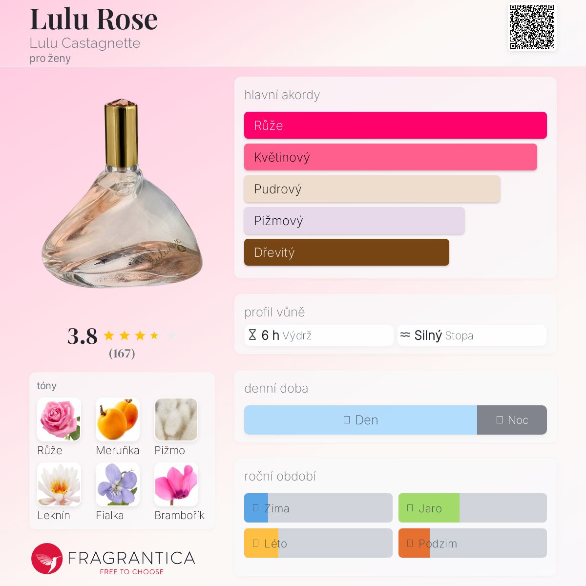 Lulu Rose podle Lulu Castagnette je Floral Fruity Gourmand vůně pro ženy. Lulu Rose byl/a uveden/a v roce 2008. "Nosem" za touto vůní je Evelyne Boulanger. Vrchní tóny jsou Fialka, Brambořík, Bergamot a Fialkový list; střední tóny jsouRůže, Meruňka a Leknín ; základní tóny jsou Pižmo, Kašmírové dřevo a Santalové dřevo.