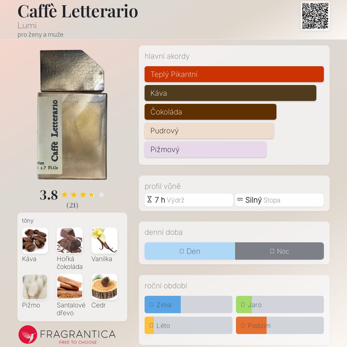 Caffè Letterario podle Lumi je Orientální Woody vůně pro ženy a muže. Toto je nová vůně. Caffè Letterario byl/a uveden/a v roce 2025. Vrchní tóny jsou Pražená kávová zrna a Čokoláda; střední tóny jsouKáva a Vanilka ; základní tóny jsou Bílé pižmo, Santalové dřevo a Cedr.