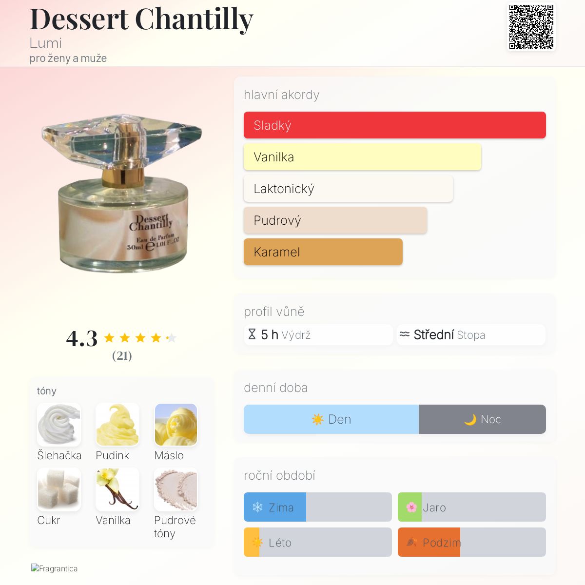 Dessert Chantilly podle Lumi je Orientální Vanilla vůně pro ženy a muže. Toto je nová vůně. Dessert Chantilly byl/a uveden/a v roce 2025. Vrchní tóny jsou Máslo, Cukr a Pudrové tóny; střední tóny jsouŠlehačka, Pudink a Karamel ; základní tóny jsou Vanilka a Bílé pižmo.