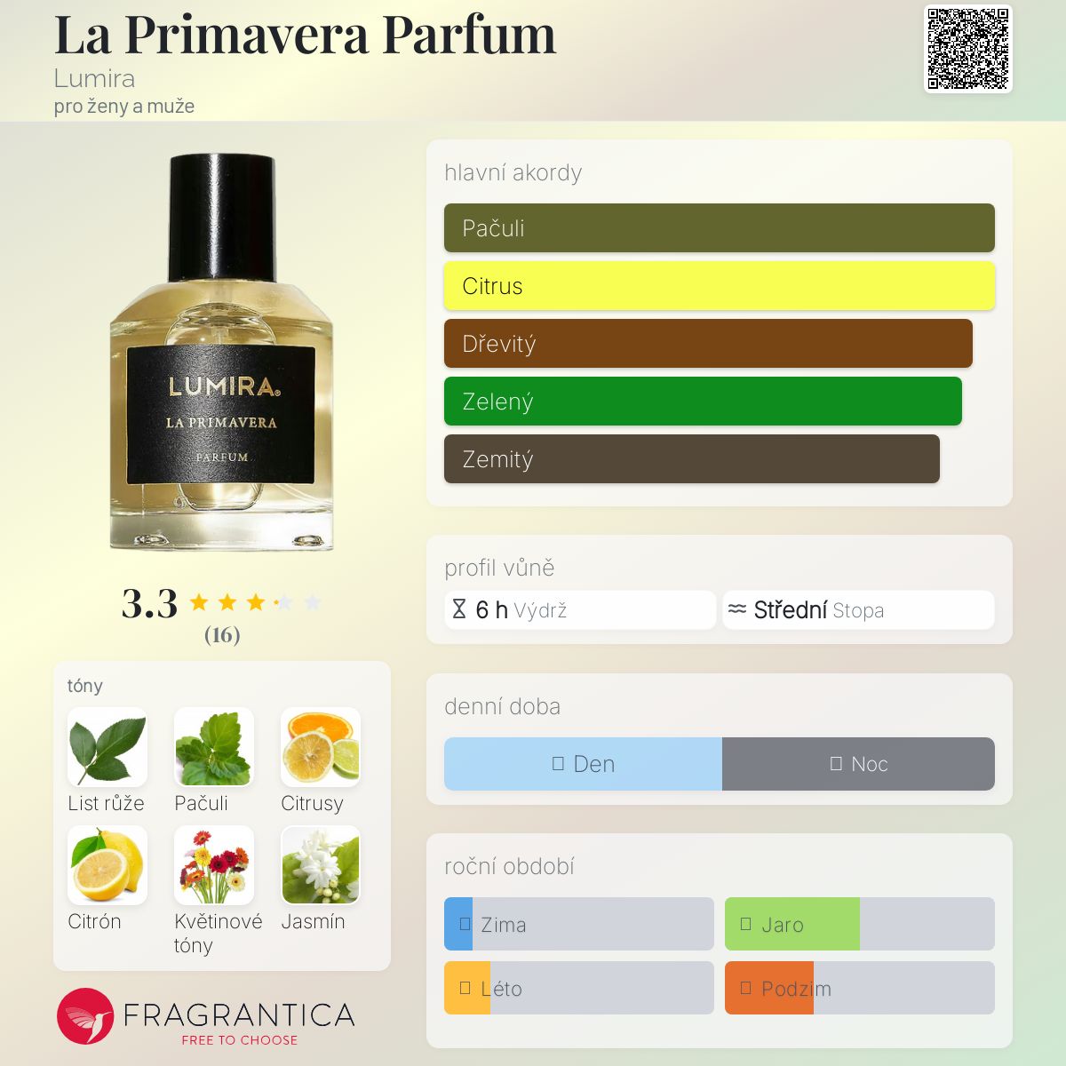 La Primavera Parfum podle Lumira je Chypre Floral vůně pro ženy a muže. La Primavera Parfum byl/a uveden/a v roce 2020. Vrchní tóny jsou List růže, Citrusy a Citrón; střední tóny jsouKvětinové tóny, Jasmín a Lilie ; základní tóny jsou Pačuli, Kašmírové pižmo, Vetiver a Mech.