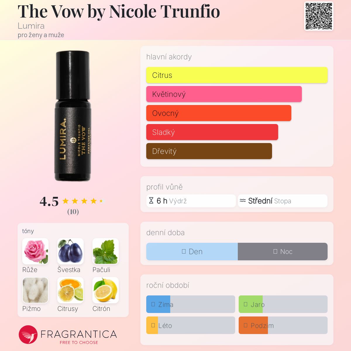 The Vow by Nicole Trunfio podle Lumira je Woody Floral Musk vůně pro ženy a muže. The Vow by Nicole Trunfio byl/a uveden/a v roce 2018. Vrchní tóny jsou Švestka, Citrusy, Citrón, Grapefruit a Maliny; střední tóny jsouRůže, Květinové tóny, Jasmín a Magnólie ; základní tóny jsou Pačuli, Pižmo, Santalové dřevo a Tabák.
