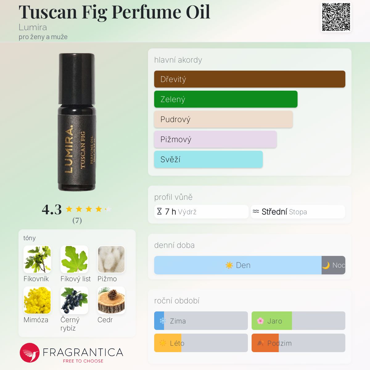 Tuscan Fig Perfume Oil podle Lumira je vůně pro ženy a muže. Tuscan Fig Perfume Oil byl/a uveden/a v roce 2016. Vrchní tóny jsou Fíkovník a Fíkový list; střední tóny jsouMimóza, Černý rybíz a Cedr ; základní tóny jsou Pižmo, Kosatec a Pačuli.