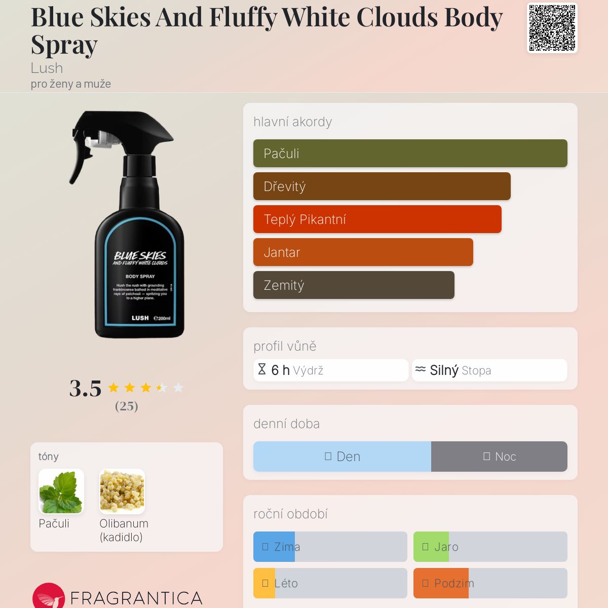 Blue Skies And Fluffy White Clouds Body Spray podle Lush je vůně pro ženy a muže. Blue Skies And Fluffy White Clouds Body Spray byl/a uveden/a v roce 1999.