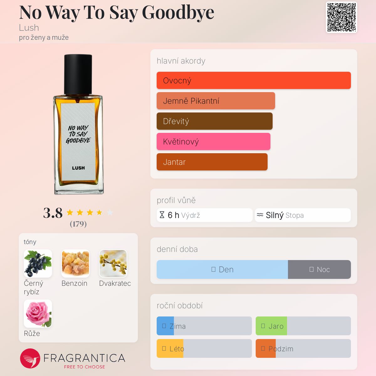 No Way To Say Goodbye podle Lush je Orientální Floral vůně pro ženy a muže. Toto je nová vůně. No Way To Say Goodbye byl/a uveden/a v roce 2024. No Way To Say Goodbye byl/a vytvořen/a Mark Constantine a Emma Dick.