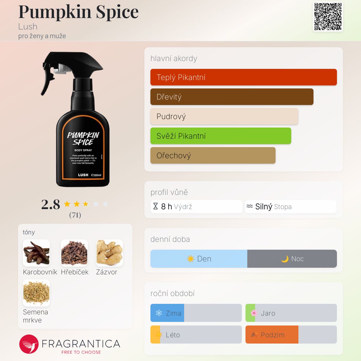 Pumpkin Spice podle Lush je Aromatic Spicy vůně pro ženy a muže. Toto je nová vůně. Pumpkin Spice byl/a uveden/a v roce 2025.