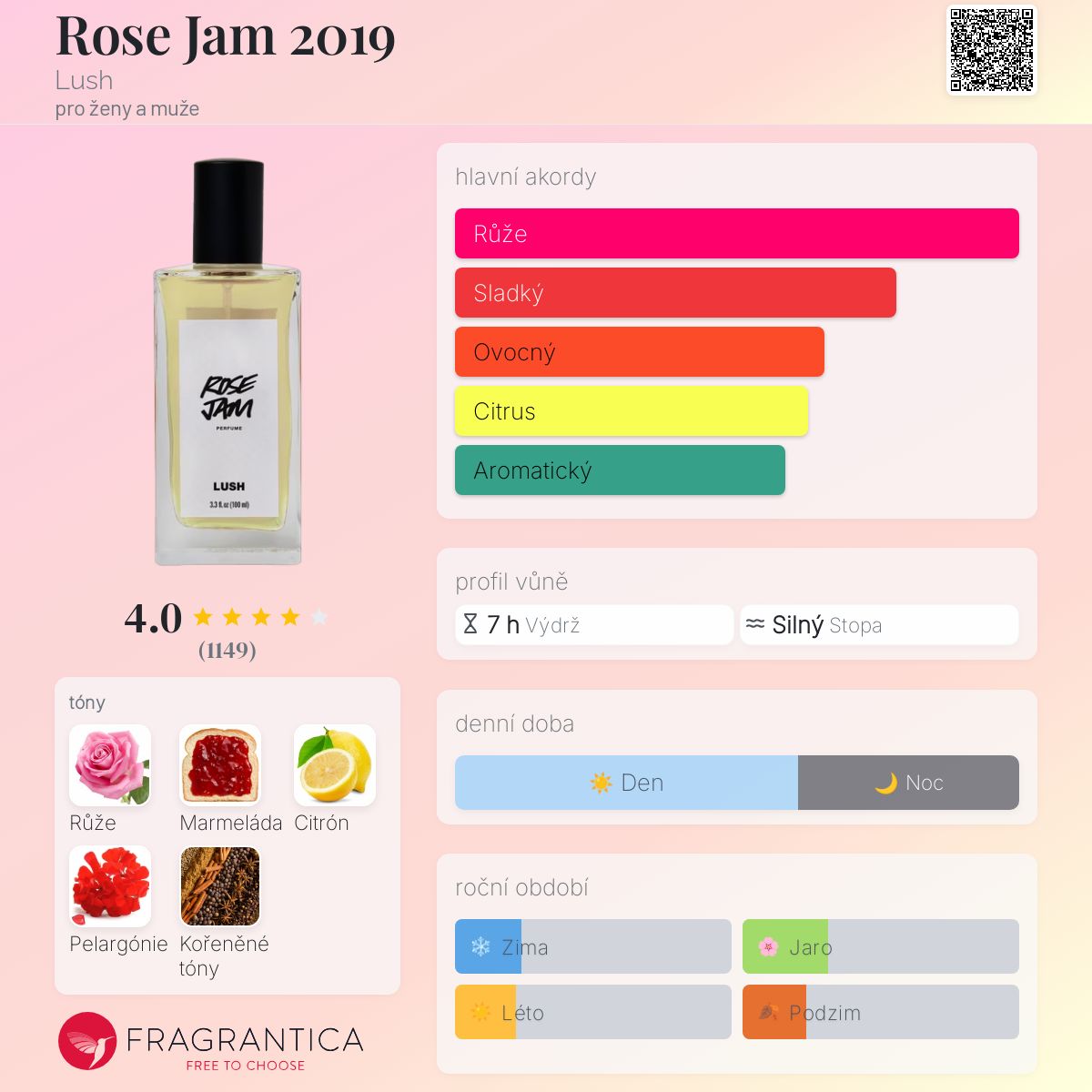 Rose Jam 2019 podle Lush je Floral Fruity vůně pro ženy a muže. Rose Jam 2019 byl/a uveden/a v roce 2019. "Nosem" za touto vůní je Simon Constantine. Vrchní tóny jsou Turecká růže, Růžový olej a Marmeláda; střední tóny jsouCitrón a Kořeněné tóny ; základní tón je Pelargónie.