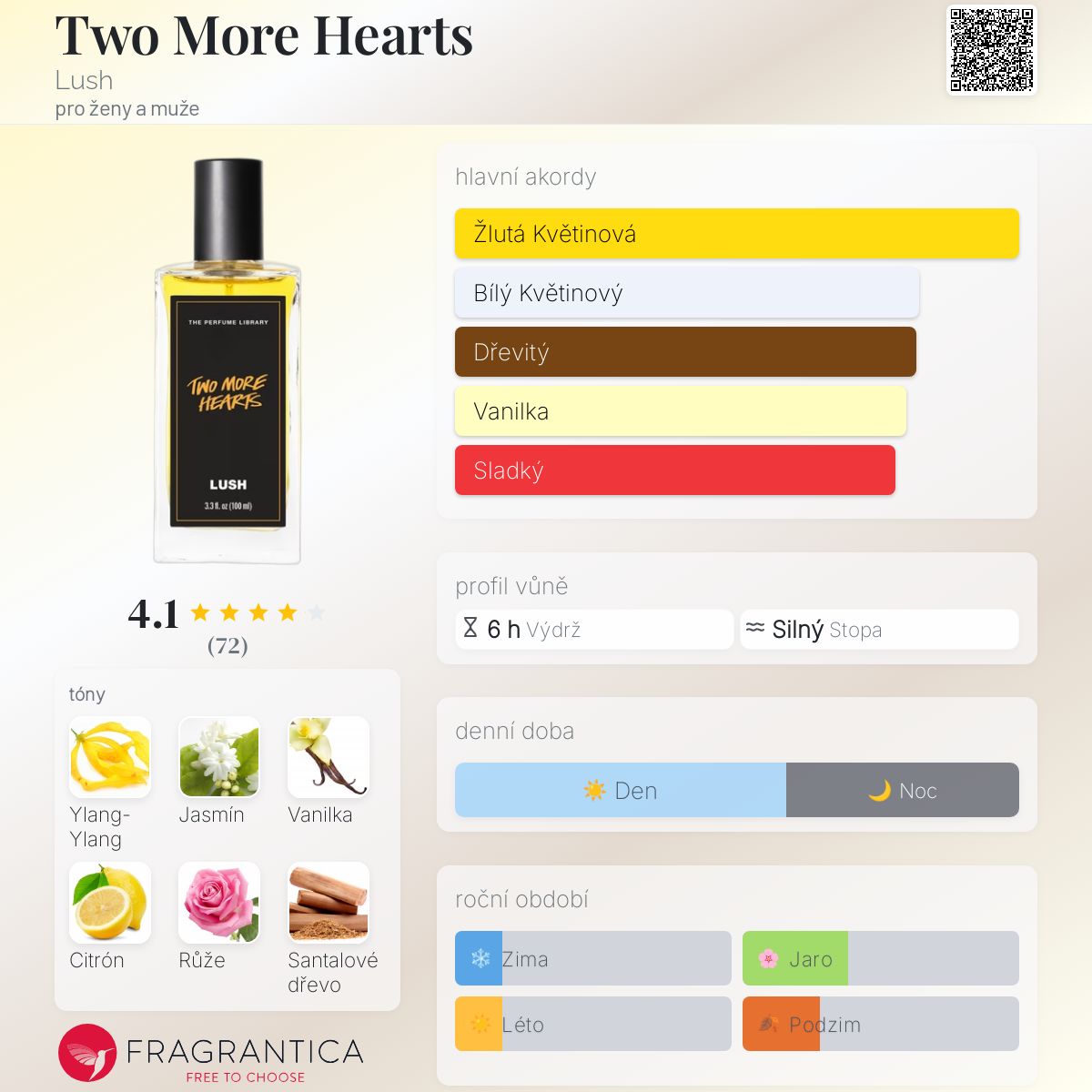 Two More Hearts podle Lush je Floral Fruity Gourmand vůně pro ženy a muže. Two More Hearts byl/a uveden/a v roce 2004. Vrchní tóny jsou Ylang-Ylang a Růže; střední tóny jsouJasmín, Sicilský citron a Santalové dřevo ; základní tón je Vanilka.