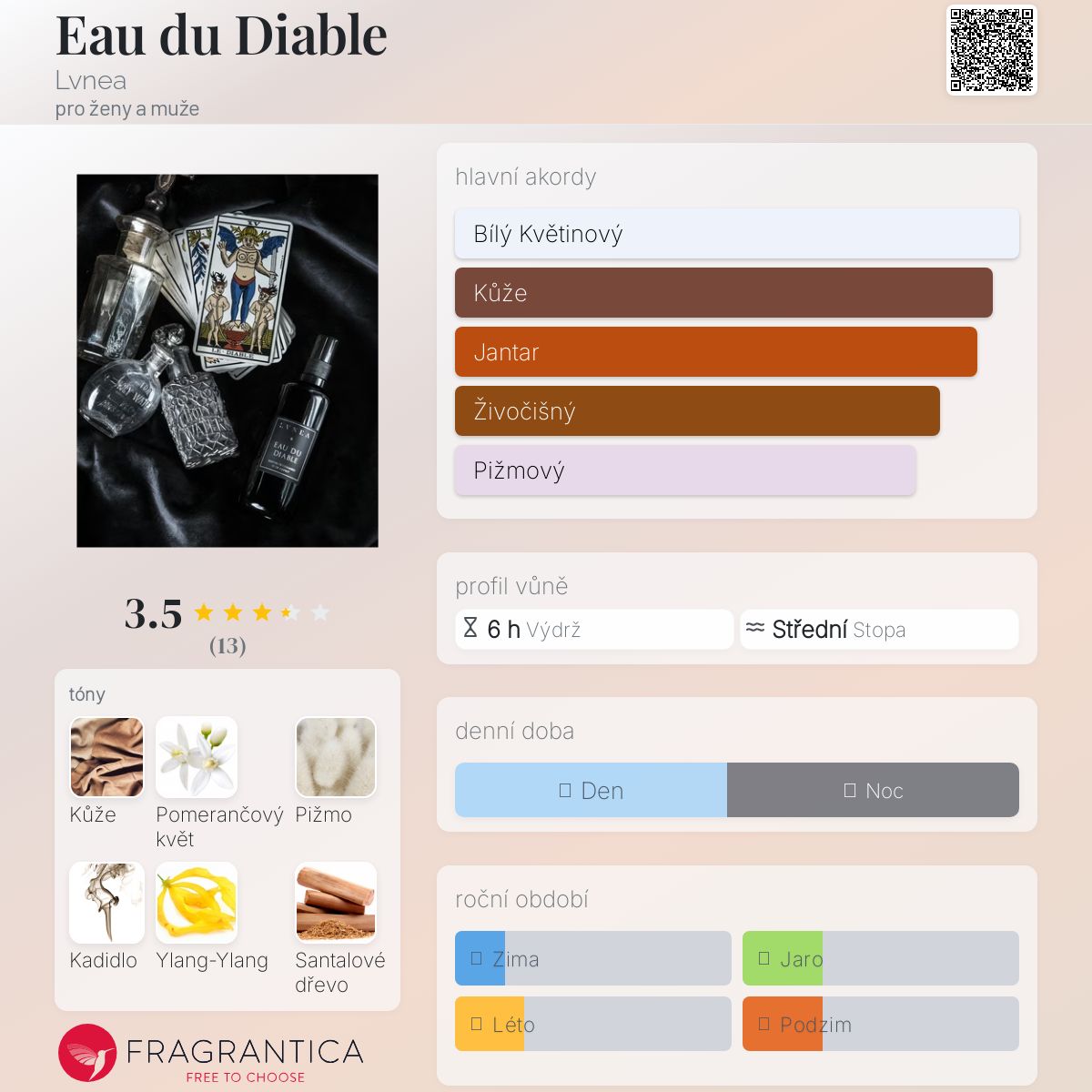 Eau du Diable podle Lvnea je Orientální vůně pro ženy a muže. Eau du Diable byl/a uveden/a v roce 2018. Vrchní tóny jsou Pomerančový květ, Ylang-Ylang a Santalové dřevo; střední tóny jsouKůže, Růže a Jasmín ; základní tóny jsou Pižmo, Kadidlo, Jantar (ambra) a Benzoin.