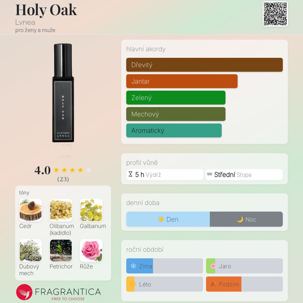 Holy Oak podle Lvnea je Woody vůně pro ženy a muže. Holy Oak byl/a uveden/a v roce 2021. Vrchní tóny jsou Cedr, Galbanum a Petrichor; střední tóny jsouKadidlo a Růže ; základní tóny jsou Cedr a Dubový mech.