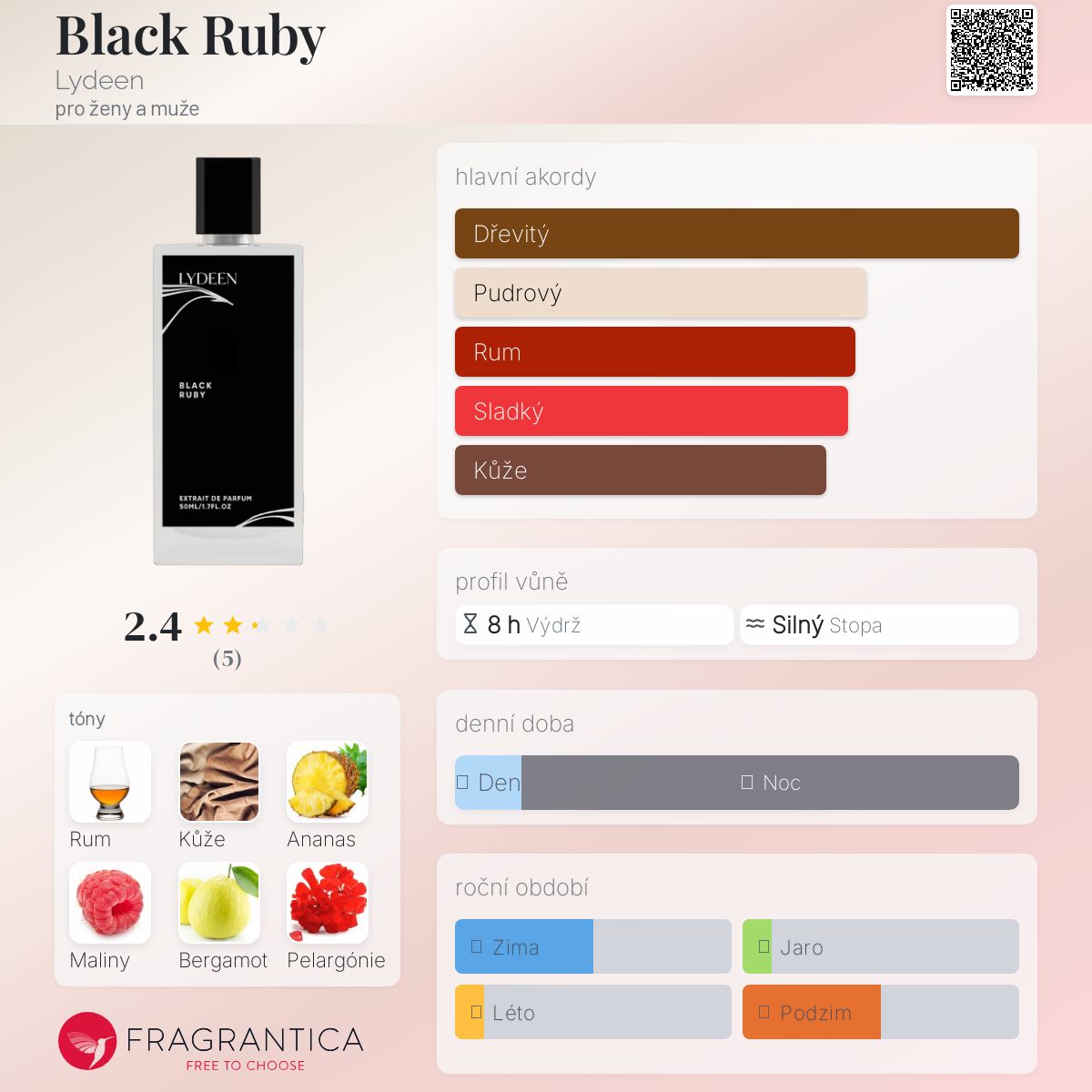 Black Ruby podle Lydeen je Orientální Woody vůně pro ženy a muže. Black Ruby byl/a uveden/a v roce 2021. Vrchní tóny jsou Rum, Ananas, Maliny a Bergamot; střední tóny jsouPelargónie, Jasmín, Fialka a Růže ; základní tóny jsou Kůže, Santalové dřevo, Pačuli, Cypriolový olej, Jantar (ambra), Fazole tonka, Pižmo, Mech a Kašmír.