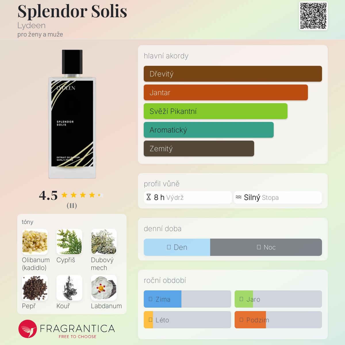 Splendor Solis podle Lydeen je Woody Aromatic vůně pro ženy a muže. Splendor Solis byl/a uveden/a v roce 2024. Vrchní tóny jsou Mandarinka, Červené víno a Máta; střední tóny jsouKadidlo, Cypřiš, Černý pepř, Cedr a Jalovcové bobulky ; základní tóny jsou Dubový mech, Kouř, Labdanum, Pačuli, Jantar (ambra), Ambra, Vetiver a Pižmo.