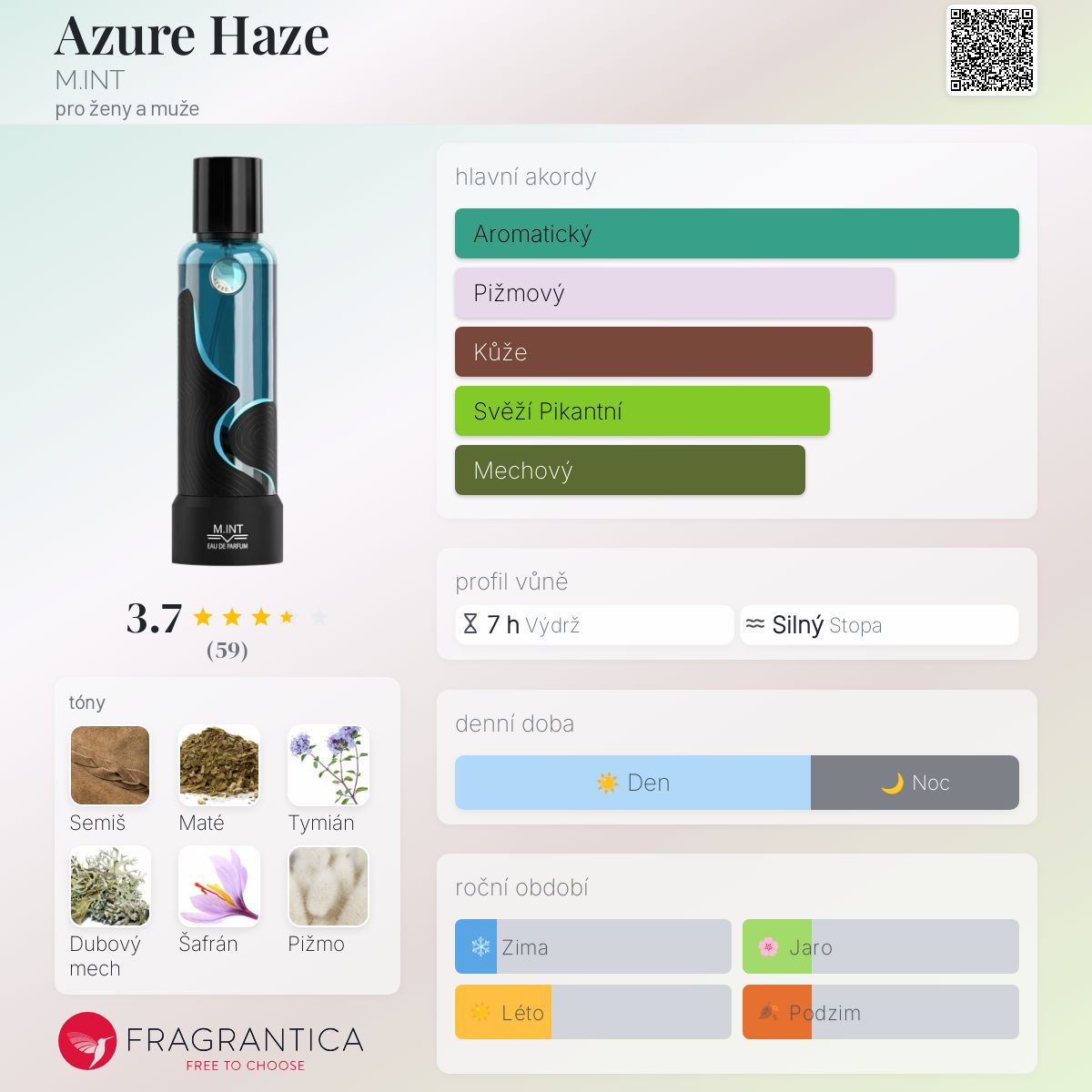 Azure Haze podle M.INT je vůně pro ženy a muže. Azure Haze byl/a uveden/a v roce 2016. "Nosem" za touto vůní je Harry Fremont. Vrchní tóny jsou Mandarinka, List koriandru a Guava; střední tóny jsouMaté, Tymián a Šafrán ; základní tóny jsou Semiš, Dubový mech a Pižmo.
