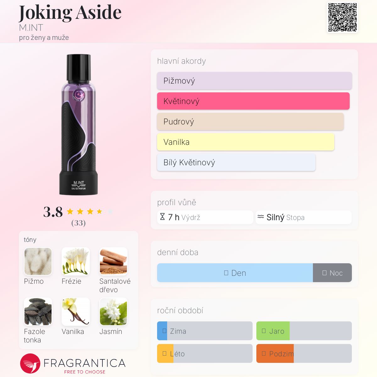 Joking Aside podle M.INT je vůně pro ženy a muže. Joking Aside byl/a uveden/a v roce 2016. "Nosem" za touto vůní je Fabrice Pellegrin. Vrchní tóny jsou Frézie, Egyptský jasmín a Koriandr; střední tóny jsouJasmín Sambac, Bulharská růže a Pomerančový květ ; základní tóny jsou Pižmo, Santalové dřevo, Fazole tonka a Vanilka.
