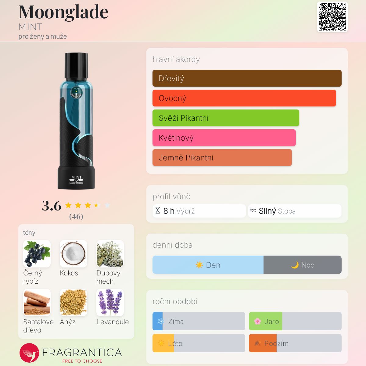 Moonglade podle M.INT je Aromatic Fruity vůně pro ženy a muže. Moonglade byl/a uveden/a v roce 2022. "Nosem" za touto vůní je Chris Maurice. Vrchní tóny jsou Černý rybíz, Bergamot, Pomeranč, Galbanum, Citrón a Růže; střední tóny jsouKokos, Anýz, Levandule, Muškátový oříšek, Broskev a Magnólie ; základní tóny jsou Mech, Santalové dřevo, Pižmo, Pačuli, Jantar (ambra) a Vanilka.