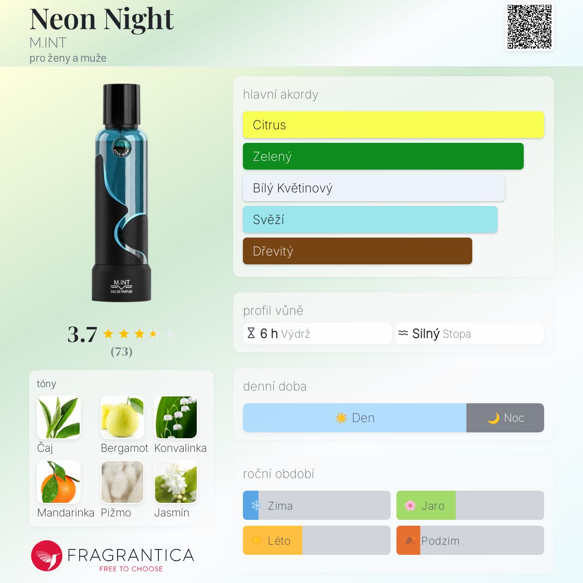 Neon Night podle M.INT je Citrus Aromatic vůně pro ženy a muže. Neon Night byl/a uveden/a v roce 2016. "Nosem" za touto vůní je Hamid Merati-Kashani. Vrchní tóny jsou Zelený čaj, Bergamot a Mandarinka; střední tóny jsouKonvalinka, Jasmín a Pivoňka ; základní tóny jsou Pižmo, Guajakové dřevo, Santalové dřevo a Jantar (ambra).