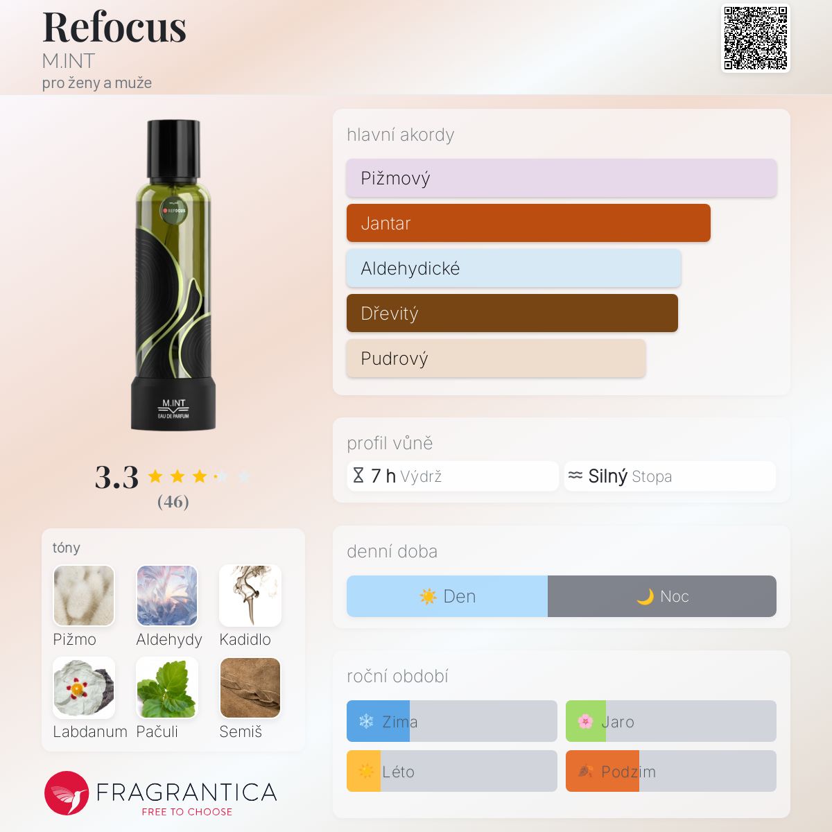 Refocus podle M.INT je Woody vůně pro ženy a muže. Refocus byl/a uveden/a v roce 2016. "Nosem" za touto vůní je Fabrice Pellegrin. Vrchní tóny jsou Aldehydy a Kadidlo; střední tóny jsouPačuli, Guajakové dřevo a Cedr ; základní tóny jsou Pižmo, Labdanum, Semiš a Santalové dřevo.