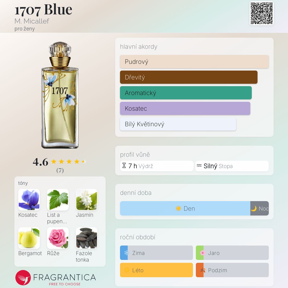1707 Blue podle M. Micallef je Floral Woody Musk vůně pro ženy. "Nosem" za touto vůní je Jean-Claude Astier. Vrchní tóny jsou Černý rybíz a Bergamot; střední tóny jsouKosatec, Jasmín a Růže ; základní tóny jsou Fazole tonka, Santalové dřevo a Bílé pižmo.
