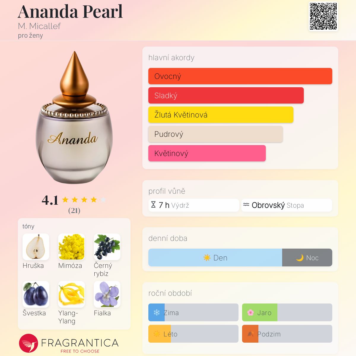 Ananda Pearl podle M. Micallef je Floral vůně pro ženy. Vrchní tóny jsou Hruška, Mimóza, Černý rybíz, Švestka a Citrón; střední tóny jsouYlang-Ylang, Fialka a Růže ; základní tóny jsou Bílé pižmo, Fazole tonka a Vanilka.