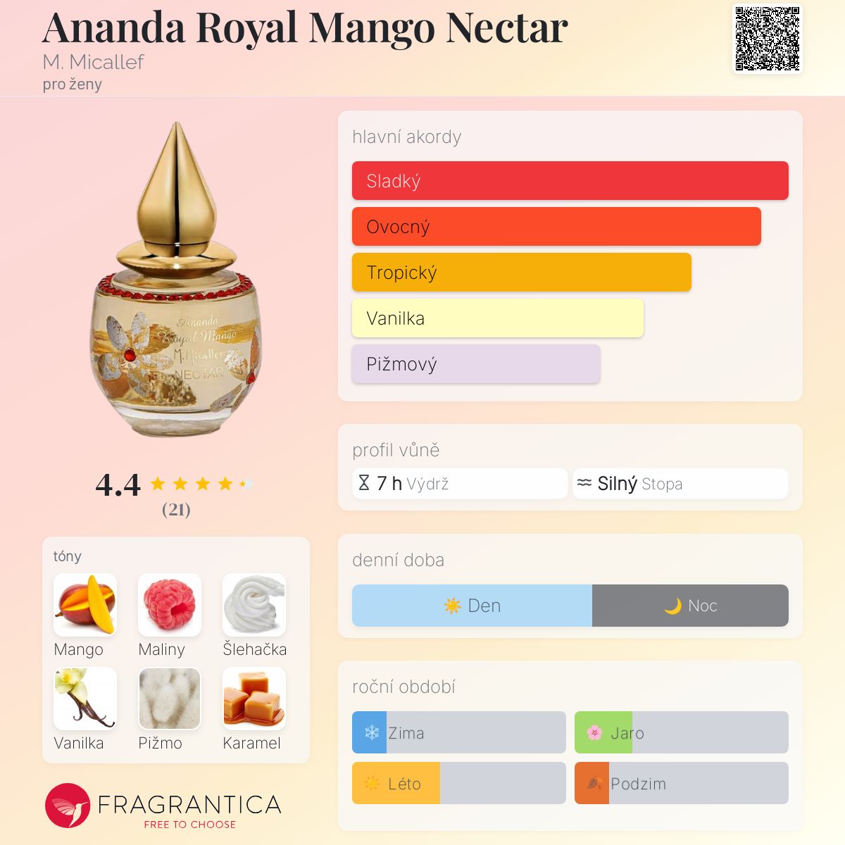 Ananda Royal Mango Nectar podle M. Micallef je Floral Fruity Gourmand vůně pro ženy. Toto je nová vůně. Ananda Royal Mango Nectar byl/a uveden/a v roce 2025. Vrchní tóny jsou Mango, Maliny a Grapefruit; střední tóny jsouŠlehačka, Karamel a Květ hedvábného stromu ; základní tóny jsou Vanilka, Pižmo, Pačuli a Jantar (ambra).