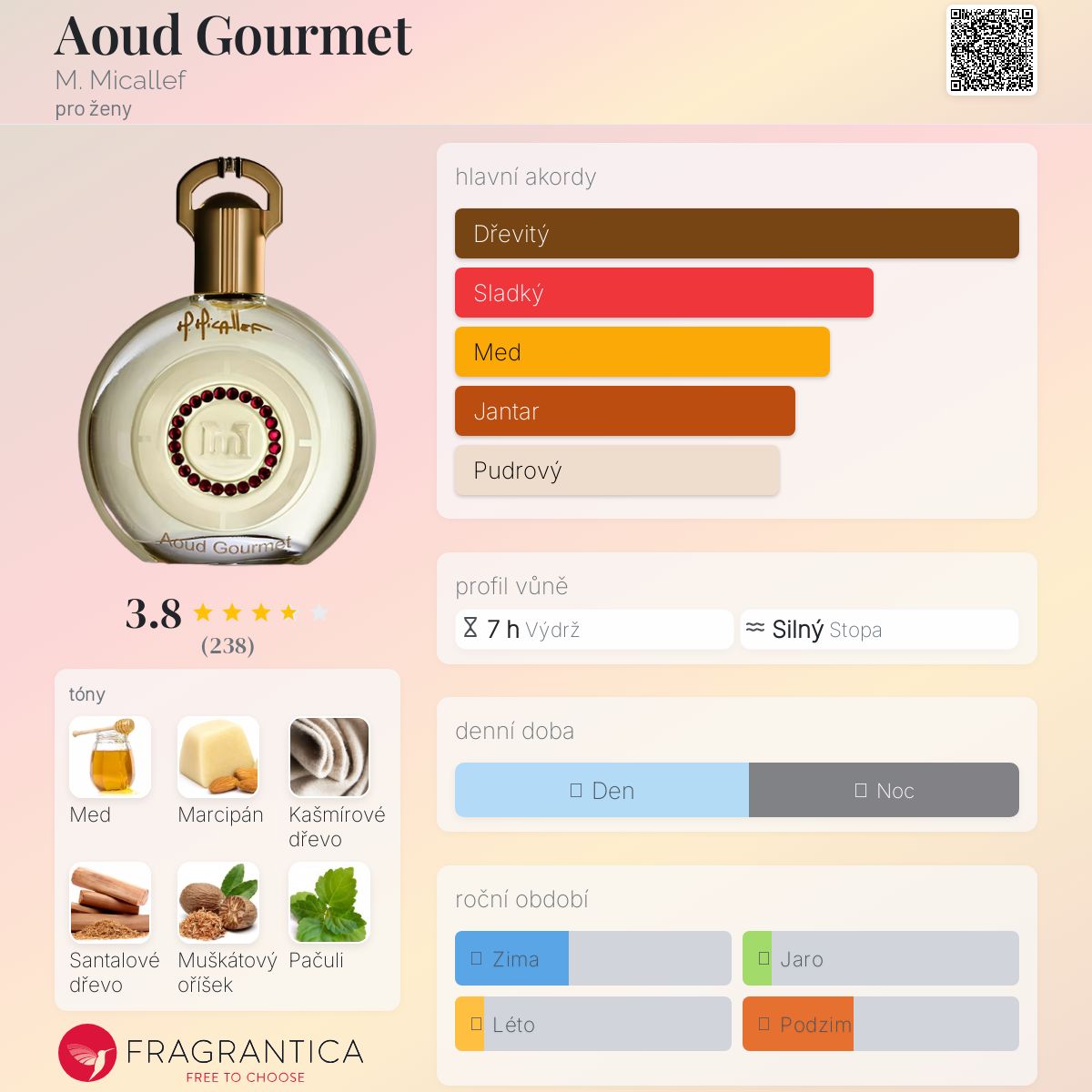 Aoud Gourmet podle M. Micallef je Orientální vůně pro ženy. "Nosem" za touto vůní je Jean-Claude Astier. Vrchní tóny jsou Bílý med a Marcipán; střední tóny jsouMuškátový oříšek, Pačuli, Cypriolový olej a Virginský cedr ; základní tóny jsou Kašmírové dřevo, Santalové dřevo, Jantar (ambra) a Pižmo.