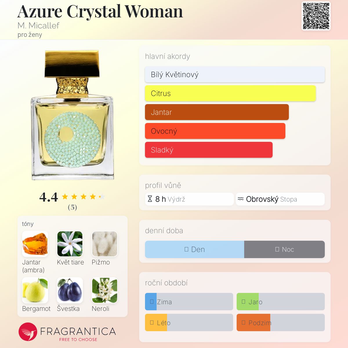 Azure Crystal Woman podle M. Micallef je Aromatic Aquatic vůně pro ženy. Vrchní tóny jsou Bergamot, Neroli a Mandarinka; střední tóny jsouKvět tiare, Švestka, Jasmín a Kakaový lusk ; základní tóny jsou Jantar (ambra), Bílé pižmo a Vanilka.