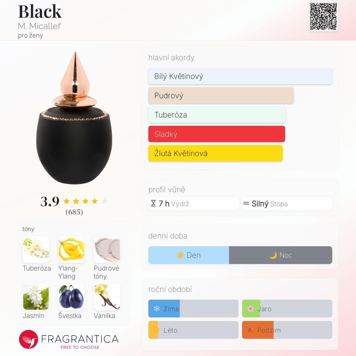 Black podle M. Micallef je Floral vůně pro ženy. Black byl/a uveden/a v roce 2011. "Nosem" za touto vůní je Jean-Claude Astier. Vrchní tóny jsou Švestka, Hořký pomeranč a Citron amalfi; střední tóny jsouTuberóza, Ylang-Ylang, Jasmín a Neroli ; základní tóny jsou Pudrové tóny, Vanilka, Benzoin a Bílé pižmo.