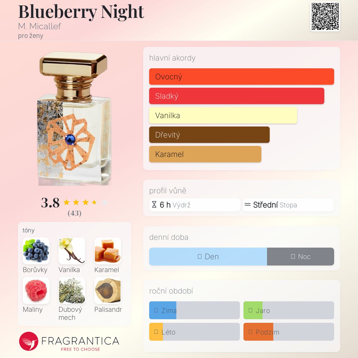 Blueberry Night podle M. Micallef je Floral Fruity Gourmand vůně pro ženy. Blueberry Night byl/a uveden/a v roce 2023. "Nosem" za touto vůní je Thierry Romeo. Vrchní tóny jsou Borůvky, Maliny a Pomeranč; střední tóny jsouKaramel a Palisandr ; základní tóny jsou Vanilka, Mech, Pačuli a Pižmo.