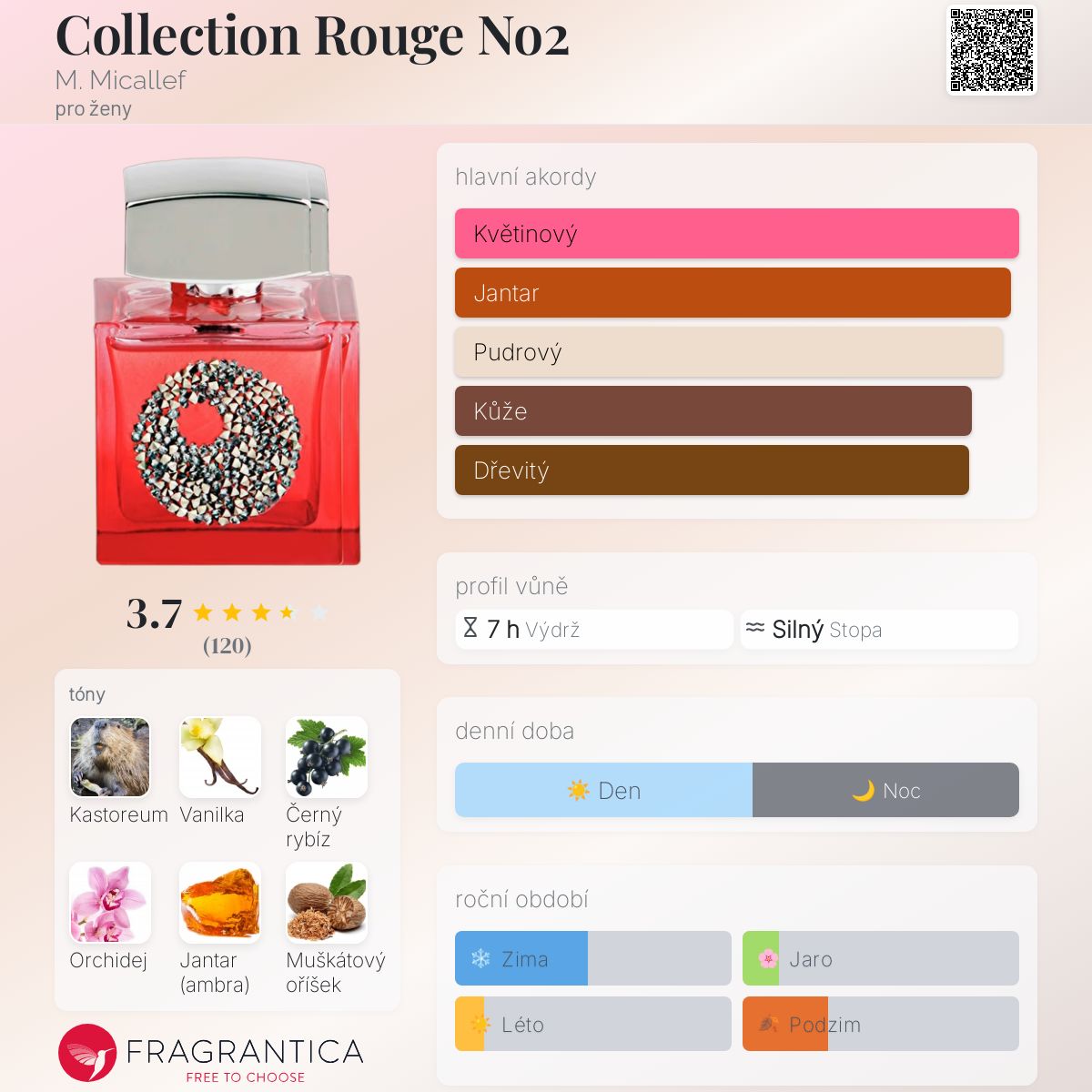 Collection Rouge No2 podle M. Micallef je Orientální Floral vůně pro ženy. Collection Rouge No2 byl/a uveden/a v roce 2013. Vrchní tóny jsou Černý rybíz, Muškátový oříšek a Citrusy; střední tóny jsouOrchidej, Fialka a Jasmín ; základní tóny jsou Kastoreum, Vanilka, Jantar (ambra) a Labdanum.