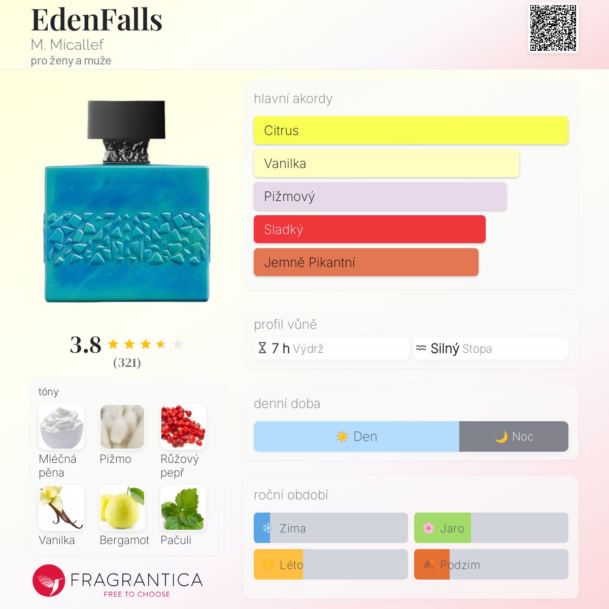 EdenFalls podle M. Micallef je vůně pro ženy a muže. EdenFalls byl/a uveden/a v roce 2021. "Nosem" za touto vůní je Geoffrey Nejman. Vrchní tóny jsou Růžový pepř, Bergamot a Mandarinka; střední tóny jsouJasmín, Neroli a Koriandr ; základní tóny jsou Mléčná pěna, Pižmo, Vanilka a Pačuli.
