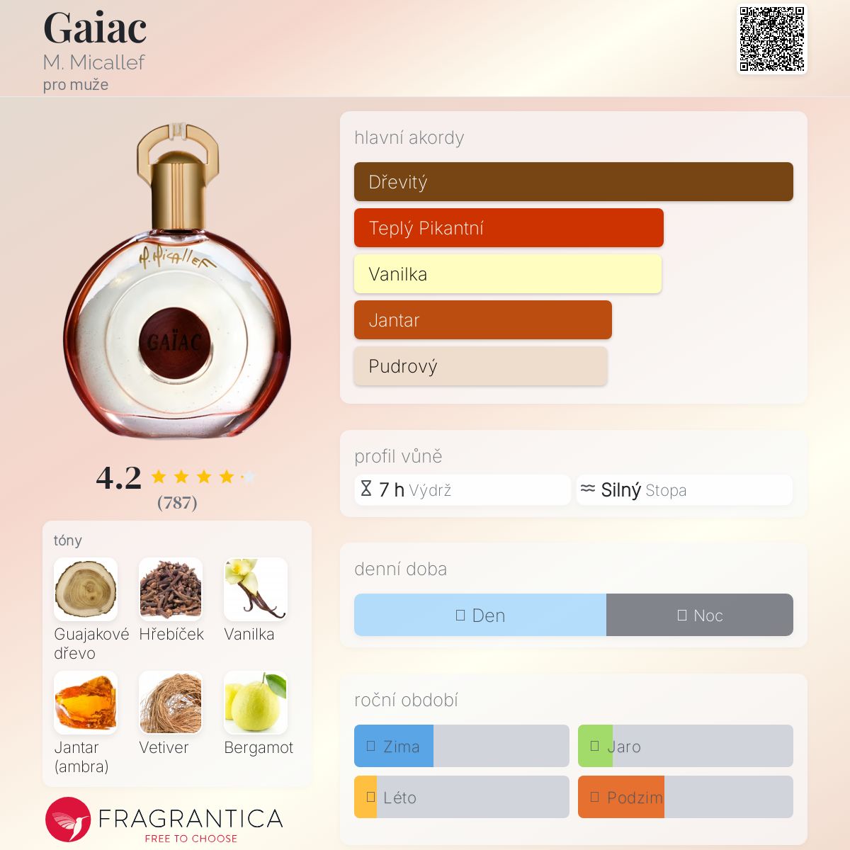 Gaiac podle M. Micallef je Woody vůně pro muže. Gaiac byl/a uveden/a v roce 2005. "Nosem" za touto vůní je Jean-Claude Astier. Vrchní tón je Bergamot ; střední tóny jsouHřebíček a Jasmín ; základní tóny jsou Guajakové dřevo, Vanilka, Jantar (ambra) a Vetiver.