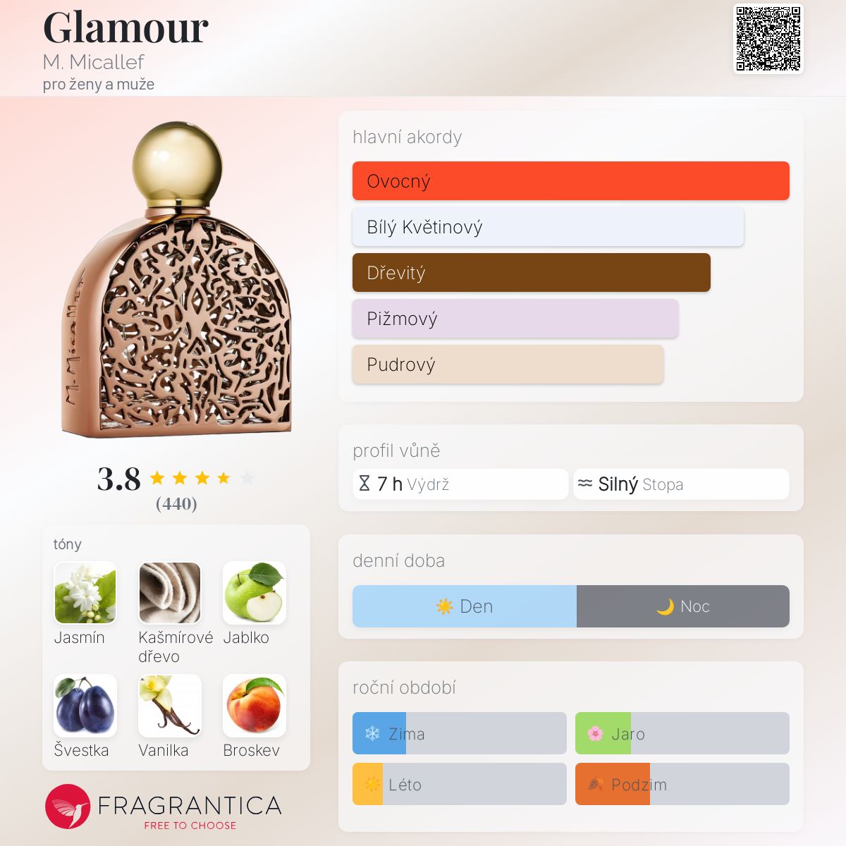 Glamour podle M. Micallef je Floral Woody Musk vůně pro ženy a muže. Glamour byl/a uveden/a v roce 2016. "Nosem" za touto vůní je Jean-Claude Astier. Vrchní tóny jsou Jablko, Broskev, Muškátový oříšek, Skořice a Šafrán; střední tóny jsouJasmín, Švestka a Růže ; základní tóny jsou Kašmírové dřevo, Vanilka, Bílé pižmo a Santalové dřevo.