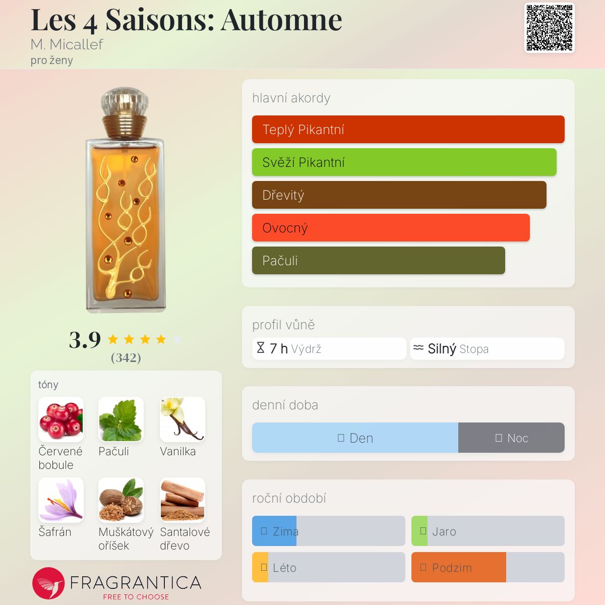 Les 4 Saisons: Automne podle M. Micallef je Woody vůně pro ženy. Les 4 Saisons: Automne byl/a uveden/a v roce 2003. "Nosem" za touto vůní je Jean-Claude Astier. Vrchní tóny jsou Červené bobule a Bergamot; střední tóny jsouŠafrán, Muškátový oříšek a Kmín ; základní tóny jsou Pačuli, Vanilka a Santalové dřevo.