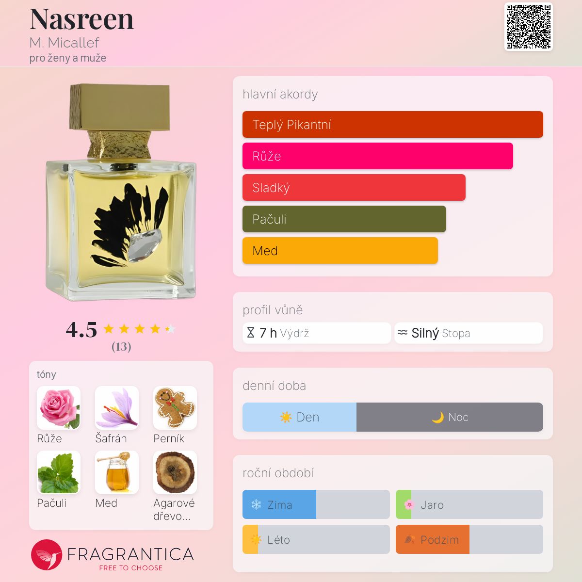 Nasreen podle M. Micallef je Orientální vůně pro ženy a muže. Vrchní tóny jsou Růže a Šafrán; střední tóny jsouPerník, Med a Kadidlo ; základní tóny jsou Pačuli, Agarové dřevo (oud) a Bílé pižmo.