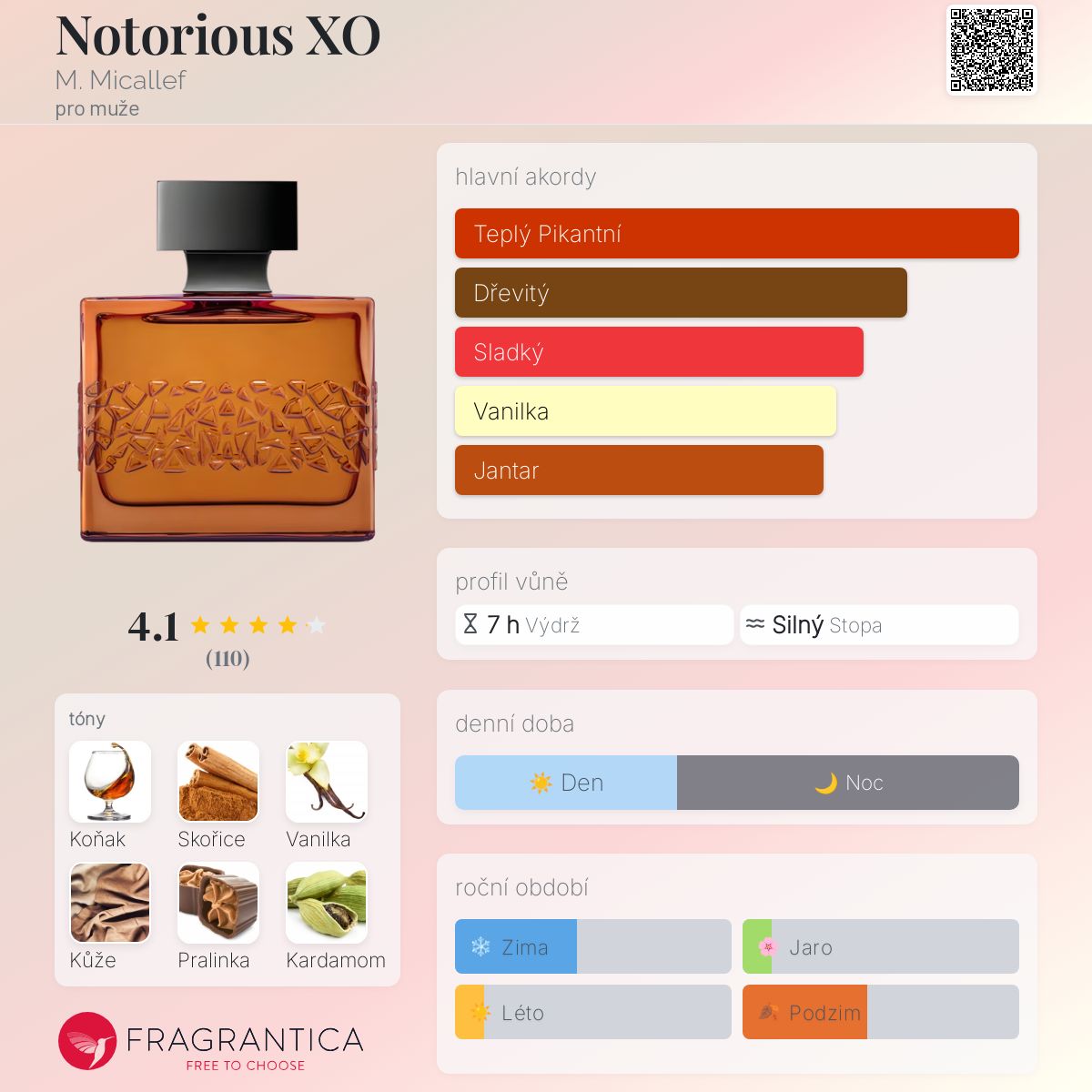 Notorious XO podle M. Micallef je Woody Spicy vůně pro muže. Toto je nová vůně. Notorious XO byl/a uveden/a v roce 2025. "Nosem" za touto vůní je Daniela Marty. Vrchní tóny jsou Koňak, Pepř a Mořské tóny; střední tóny jsouSkořice, Kůže, Kardamom, Fazole tonka a Dub ; základní tóny jsou Vanilka, Pralinka, Jantar (ambra), Santalové dřevo a Pižmo.
