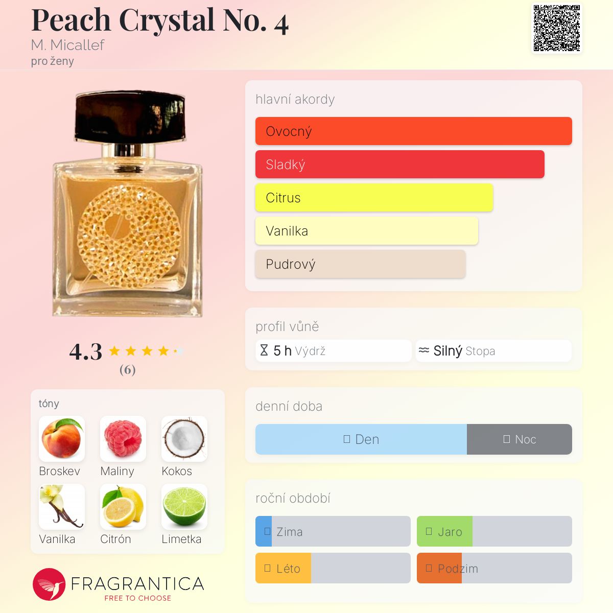 Peach Crystal No. 4 podle M. Micallef je Aromatic Fruity vůně pro ženy. Peach Crystal No. 4 byl/a vytvořen/a Geoffrey Nejman a Jean-Claude Astier. Vrchní tóny jsou Maliny, Citrón a Limetka; střední tóny jsouBroskev a Jasmín ; základní tóny jsou Kokos, Vanilka a Pižmo.